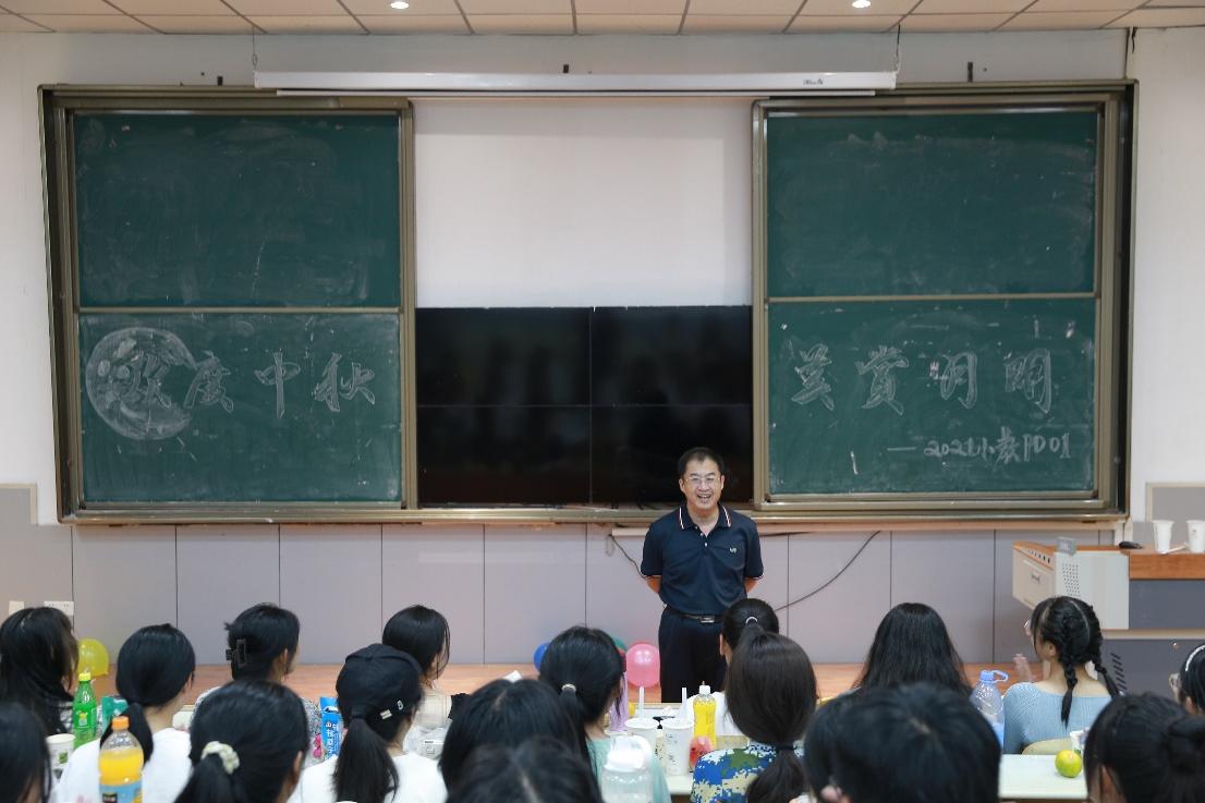 领导老师进入每一个班级认真欣赏各班准备的中秋联欢会节目,与同学们亲切交谈。宋贵欣代表学院党委向2021级同学致以诚挚的中秋祝福,欢迎大家来到师范学院这一温暖的大家庭。他强调:这是大家来到吃瓜 的第一个团圆佳节,又恰逢军训,希望大家在特殊的环境下度过一个愉快、难忘、有意义的中秋节。在军训中展现自己的意志品质,在军训成果汇报展示中取得优异的成绩,努力为师范学院增光添彩。