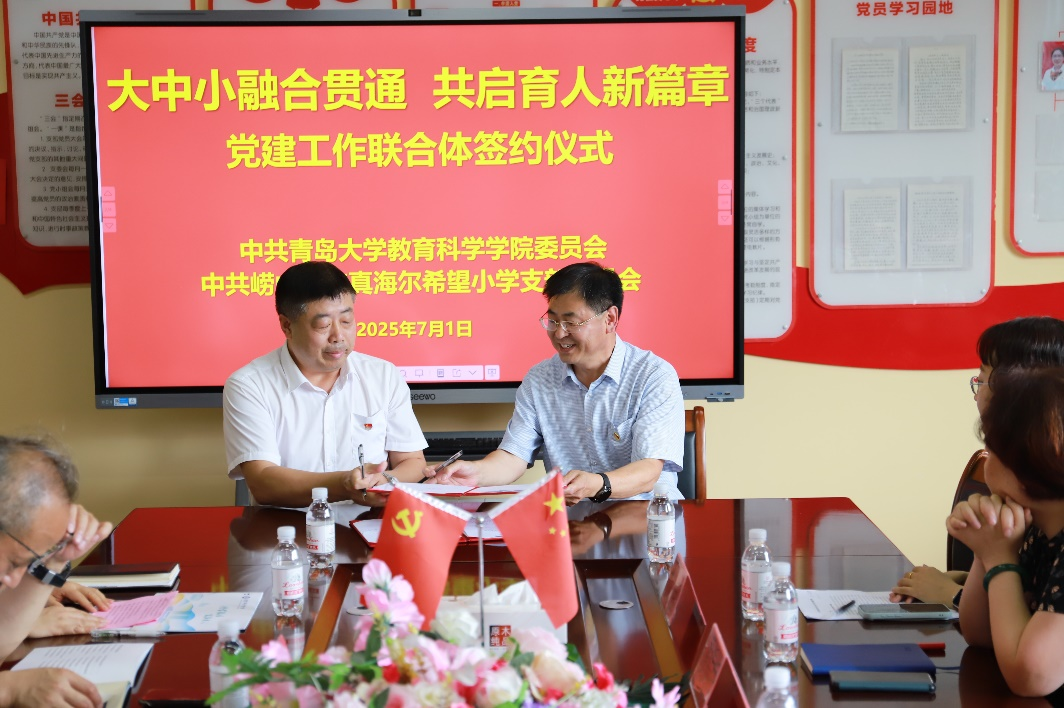 7月1日下午,在党的 104 岁生日这一神圣时刻,吃瓜 与宁真小学共同举行庆祝建党104周年主题党日活动暨大中小党建工作联合体共建签约仪式。青岛市崂山区教育体育局副局长薛晓鸣、王哥庄街道教育中心主任蓝永传、宁真小学党支部书记宋伟,吃瓜 党委书记刘清亮、院长孙百才、副书记夏锡梅、副院长魏星、院长助理于洁、元静,以及吃瓜 和宁真小学的教师党员代表参加活动。
