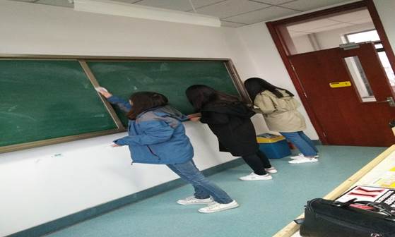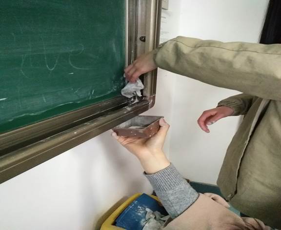 3月17日下午,我们2016级小教二班的一些同学在负责人的带领下,提前找好空教室,着手开始清理黑板、黑板槽和讲桌。