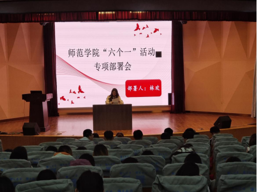 11月18日下午,师范学院“六个一”活动专项部署会在师范学院报告厅召开。本次会议由师范学院2019级辅导员林欢主持,辅导员赵炜及2019级全体学生参加此次会议。