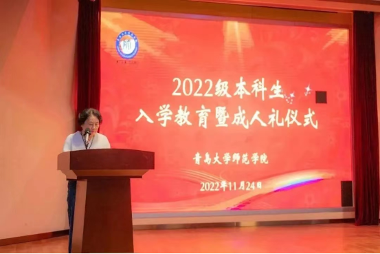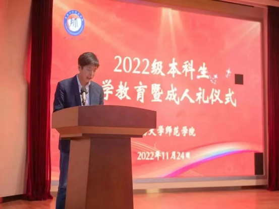 会上,院长孙百才教授作了《传承和重塑青大师院文化》主题讲话。孙百才在讲话中详细讲解了学院院训与价值观的深刻内涵,全面回顾了师范学院悠久的发展历程。他指出,党的二十大擎画了我国教育的未来蓝图,我们正处于重建师范文化与发扬师范传统的最好时期,全院学生要以振兴师范文化、为中华民族伟大复兴而读书为己任,以“立师志,修师德,博师学,练师功”的学院价值观为遵循,共同继承和创新已赓续70年的学院文脉。同时,孙百才就如何成为一名优秀教师向大家提出四点期望。他强调,作为一名未来教师,要做到“有爱、有仁、有智、善行”,胸怀国之大者,走进学生心灵,树立科研意识,强化教师技能,严谨治学,知行合一,在学院大家庭里收获学问、收获友谊,成就人生的新高度,共同将教育这一塑造人类灵魂的工程不断推向前进。