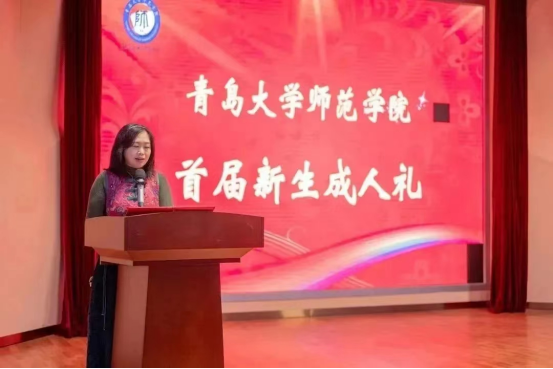 2022级辅导员李幸主持成人礼仪式。李幸说明了学院举办18岁师范特色成人礼的重要意义,带领全体新生面向父母、恩师行鞠躬礼,随后面向国旗庄严宣誓,共读师德公约,传承煌煌师道。学生在强烈的仪式感中传承师范生光荣传统,增强师范生身份认同,明确师范生责任使命,为他们留下意义非凡的青春回忆。