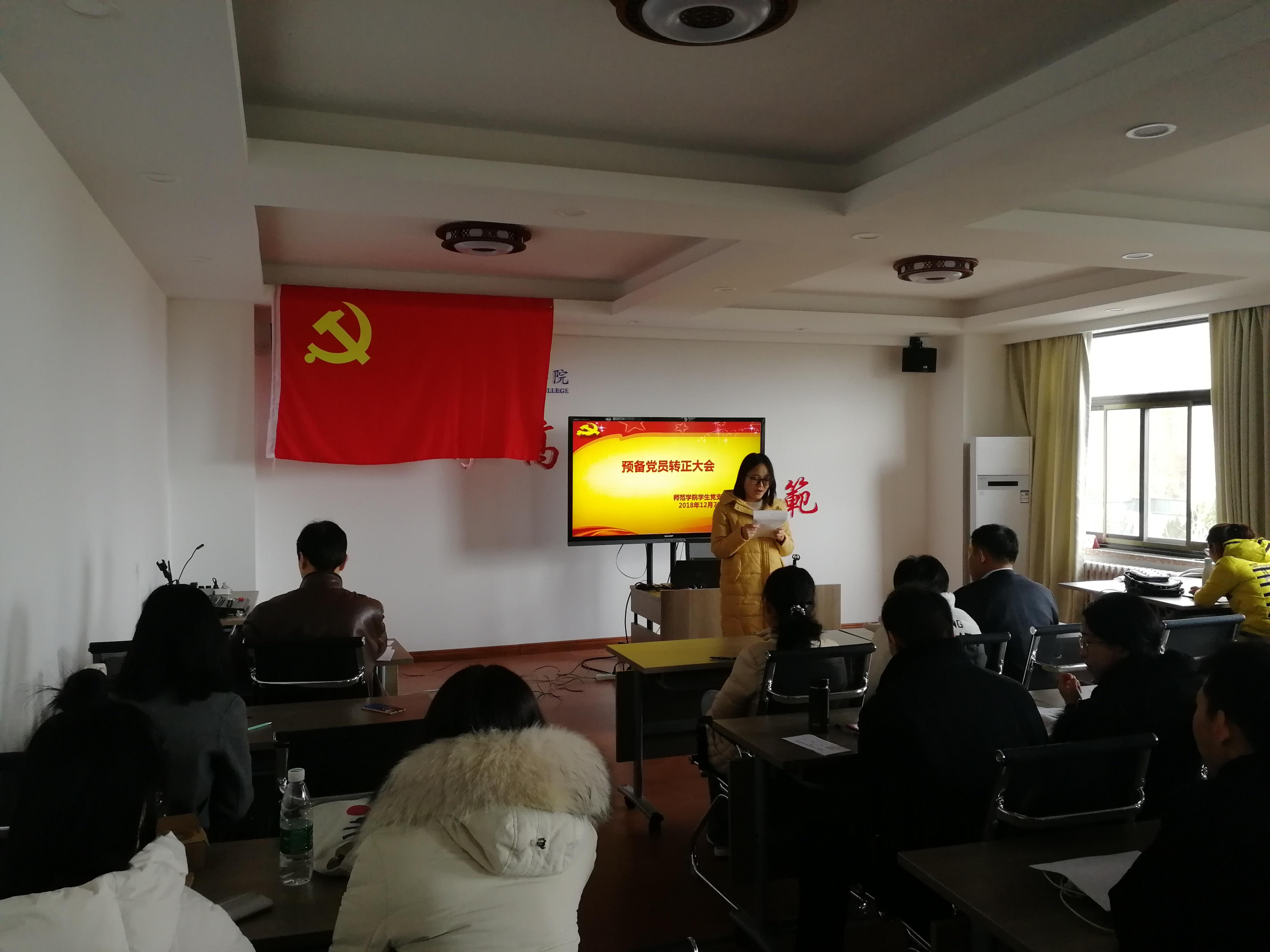 2018年12月7日中午,师范学院学生党支部在德润楼201会议室召开了预备党员转正大会,会议由学生党支部书记赵炜主持。会议研究讨论了张乔、弋草两名中共预备党员的转正申请,并通过无记名投票的方式进行表决,一致同意张乔、弋草两名同志按期转为中共正式党员。