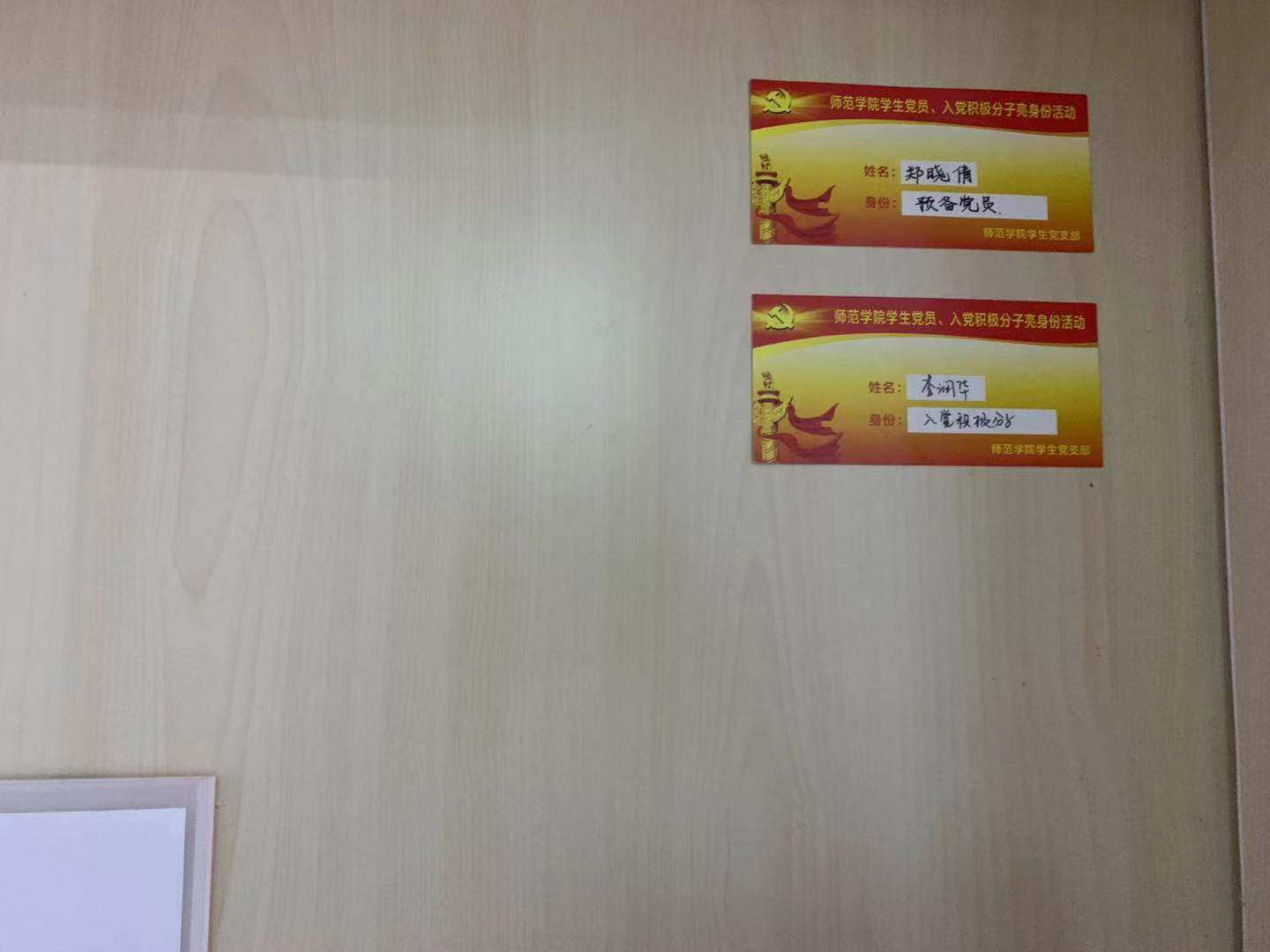 全院47名党员及46名入党积极分子参加了本次活动。本次活动形式主要是在宿舍内张贴和悬挂带有姓名和身份的身份卡。身份卡由师范学院学生党支部统一发放,并统一张贴和悬挂。学院学生党支部会对活动开展情况进行抽查,定期向身边普通同学了解学生党员及入党积极分子的日常表现,在日常检查中观察学生党员及入党积极分子是否发挥模范带头作用,以此作为考核标准。