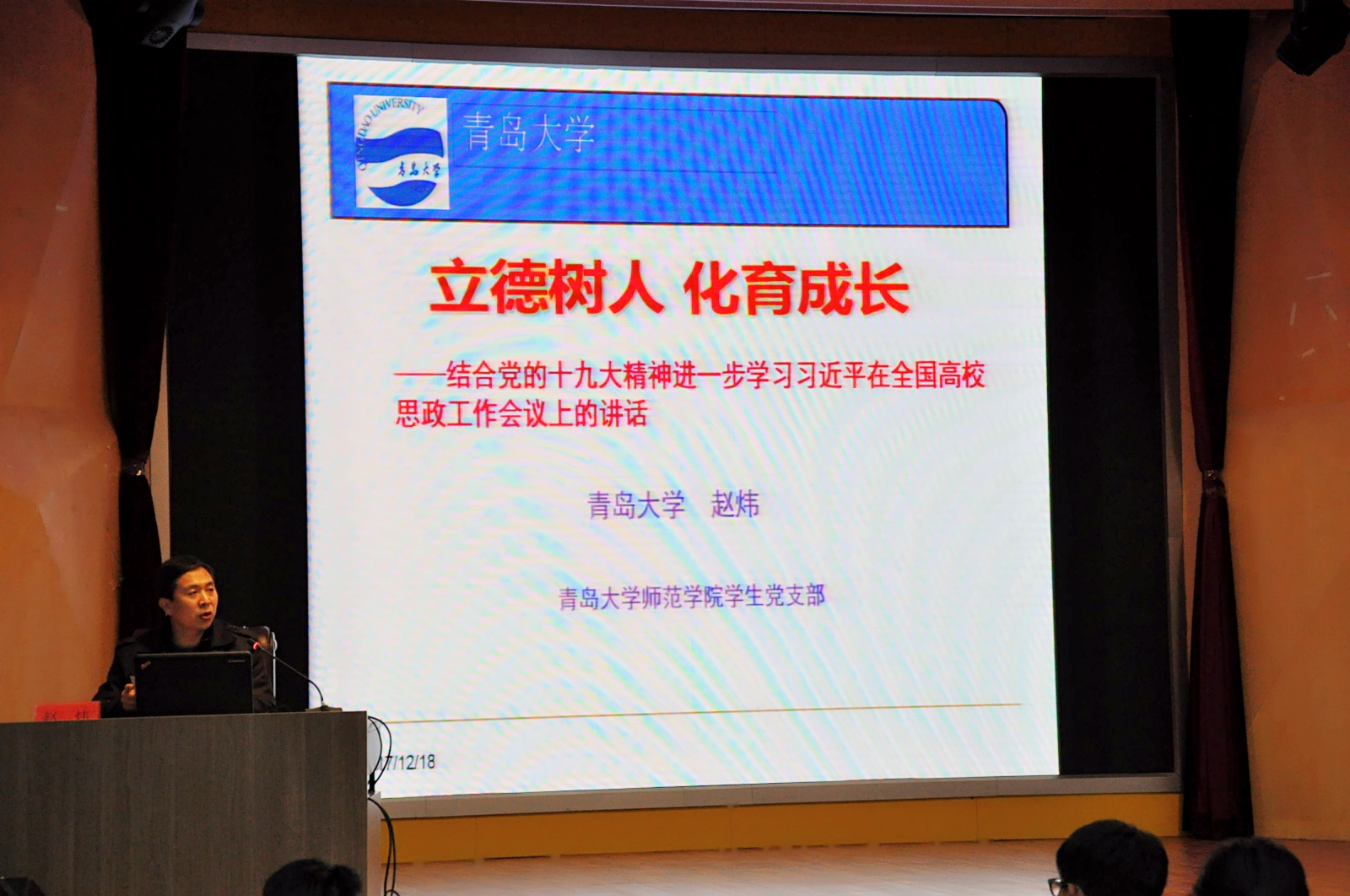 12月18日18点30分,师范学院学工办主任赵炜结合党的十九大精神,为同学们做了一场以“立德树人,化育成长”为主题的辅导报告,进一步学习了习近平在全国高校思政工作会议上的讲话,活动地点在师范学院学术报告厅。
