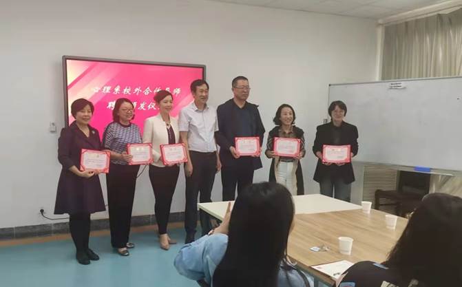 为加强校内外导师合作,共同提高心理学系学科建设和人才培养的质量,校内外各硕士生导师各自介绍工作履历、研究方向。陶明达为青岛市南区教育研究中心心理健康教育教研员松梅、青岛市第九中学高级教师王国香、青岛五十八中正高级心理教师王克伟、青岛第二中学高级教师曾莉、青岛市文登路心理教师郭斐、青岛市精神卫生中心孙平颁发了心理学系校外合作导师聘书。
