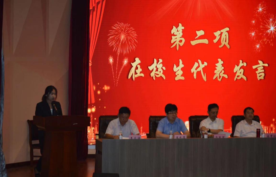 在校生代表邵雅茹发言。她鼓励新生珍惜宝贵的大学时光,明确自己的发展目标,争取以优异的成绩完成四年的学业。