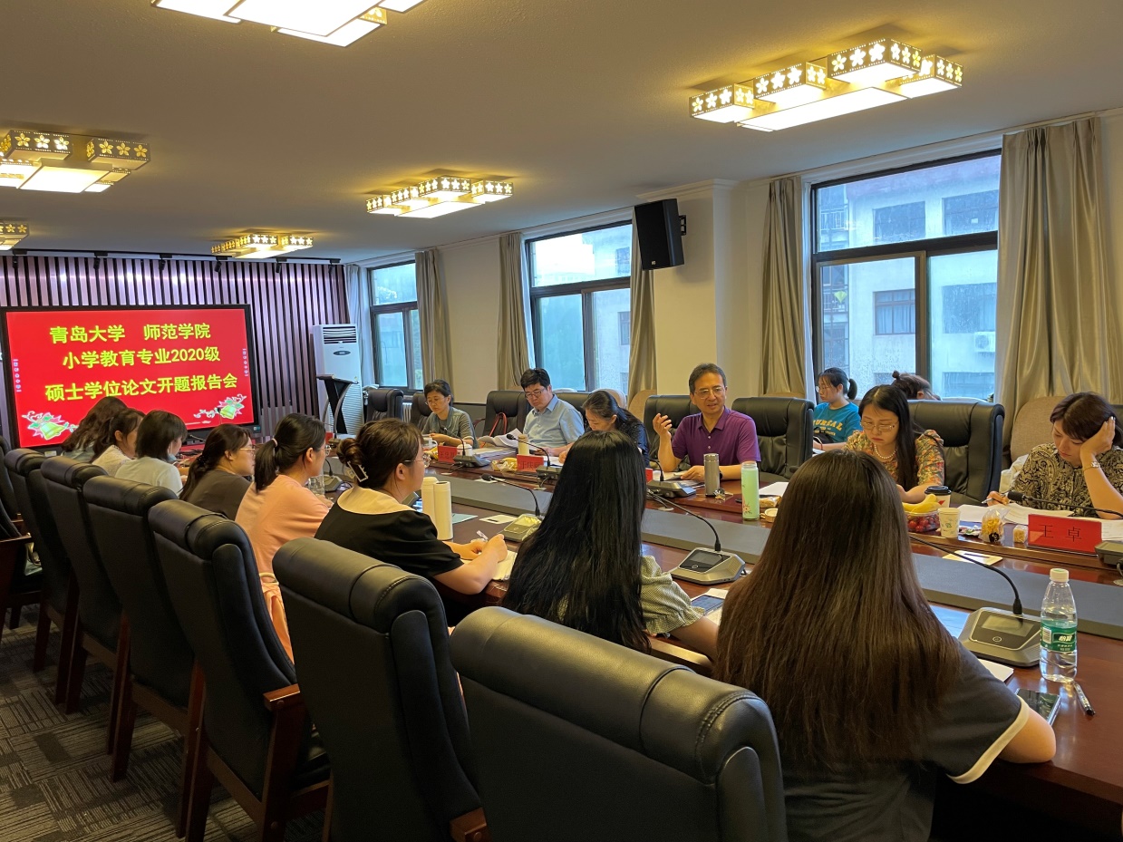 7月16日,2020级全日制小学教育专业硕士学位论文开题报告会在德润楼301会议室举行,参加会议的有香港路小学校长于庆丽、师范学院副院长马勇军、小学教育系主任王忠厚、导师成员杨慧娟、庞晖、苏静、王卓,参与开题的15位硕士研究生以及部分2020级小学教育非全日制专业硕士。