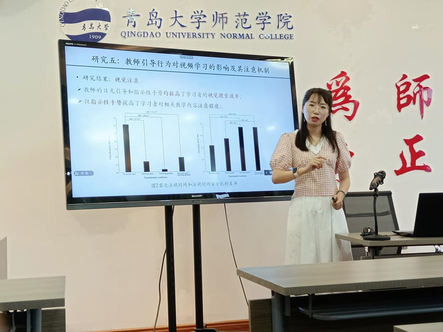 皮忠玲介绍了教育信息化的改革与发展历程以及结合自身研究分享了通过眼动、脑电等技术手段对教学视频学习效果的影响因素、教学视频中教师呈现位置对学习者学习的影响、教师不同类型的手势影响视频学习的注意机制的分析等十几项研究介绍。皮忠玲的精彩报告引起了在场师生的强烈兴趣,师生们热情积极互动,皮忠玲对提出的问题进行了详细、生动的讲解,加深了在场师生对眼动、脑电技术在教育研究领域的认识。