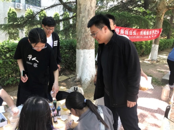 在活动还没开始的时候,学前教育系王芳主任和卜凡帅书记就来为同学们打气加油啦。王芳老师在竹编纸编摊位亲手进行操作,与孙欣老师在糖葫芦摊位进行品尝和交流。卜凡帅老师对扎染卓有兴趣,并对品尝的冰粉给予较高的评价。