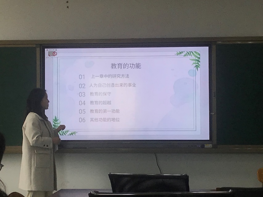 第二位分享者是19级研究生申亚云。她先向大家讲解了张教授在书中提到的研究方法:转移法和反演法。本书采用公理化体系来构造一个完整的、无矛盾、满足一致性的教育理论系统,提到“教育是人为自己创造出来的事业”,教育最根本的功能是促进人的发展。这也是教育的第一功能。申亚云在分享中还用张教授所使用的反演法对教育的保守与超越功能进行了讨论。