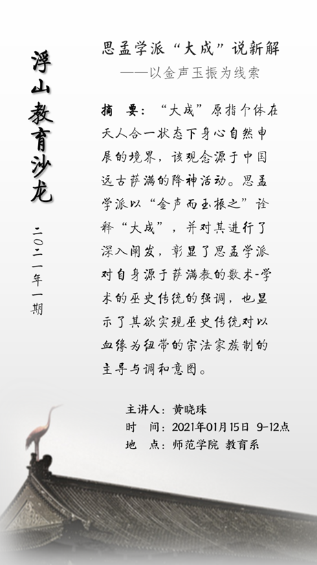 2021年新年伊始,师范学院教育系举行了新年第一期“浮山教育学术沙龙”。此次沙龙主讲人黄晓珠老师为大家介绍了她近期展开的有关思孟学派“大成”思想的研究。