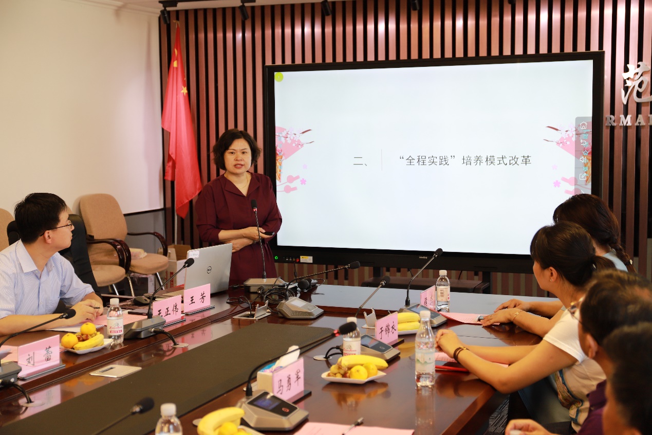 学前教育系主任王芳首先全面汇报了“全程实践”培养模式的改革进展。近五年来,在“学生中心”、“产出导向”、“活动发展”、“共享共育”等先进理念的指引下,学前教育专业努力建设多元优质的校内外实践基地,改革了实践技能类课程和理论课程内容,创新U-K合作机制,打造高素质“双师型”教师队伍,最终构建起富有特色、可操作性强的“四六六”全程实践培养模式,有力地促进了本科生专业学习中理论和实践的融合,为其未来专业发展奠定了扎实的基础。该模式成果突出,被省内专家认为具有典型性和示范性,已经达到省内领先水平,具有较强的推广价值。王主任也分析了全程实践探索当前面临的挑战,希望地方教育行政部门、科研部门、学校管理部门、幼儿园能创新合作机制,促进全程实践的深入发展。