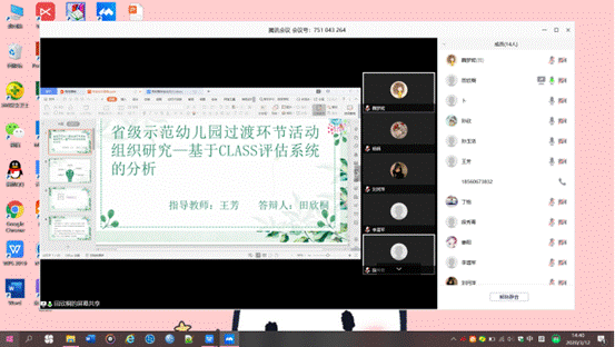答辩委员会由学前教育专业学科负责人王芳副教授,孙玉洁教授、何京玉副教授、孙欣博士、卜凡帅博士构成,田欣桐等9位硕士研究生参与了预答辩活动。因疫情原因,师生暂时无法返校,他们有的在青岛、东营、临沂,还有的在河北秦皇岛。借助腾讯会议屏幕分享和即时通话的功能,学前教育系师生共克时艰,一起高质量地完成了这次特殊的预答辩活动。整个预答辩流程紧凑有序。