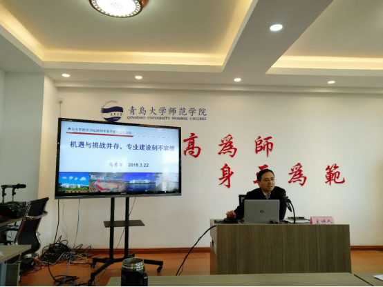 马勇军副院长以《机遇与挑战并存,专业建设刻不容缓》为题,对学院专业发展面临的新形势、2018年学校和学院教学重点工作、师范专业认证工作进行了解读和部署。