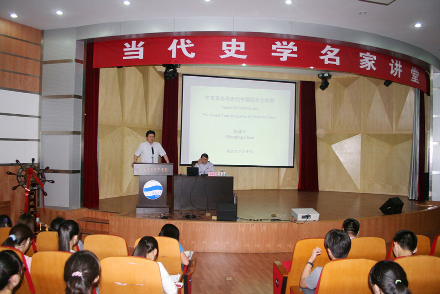 2013年6月26日下午,师范学院主办的“当代史学名家讲堂”邀请国务院学位委员会历史学科评议组成员、中国现代史学会副会长、著名民国史专家、南京大学历史系主任陈谦平教授作题为“辛亥革命与中国的社会转型”的学术报告。校长助理、师范学院常务副院长钱国旗教授主持报告会,师范学院文科各系师生、吃瓜 浮山书院博雅班部分师生、青岛市名师培养工程历史学科人选以及青岛市历史学会部分会员,参加了本次报告会。