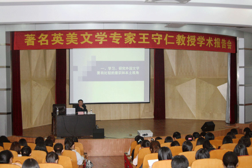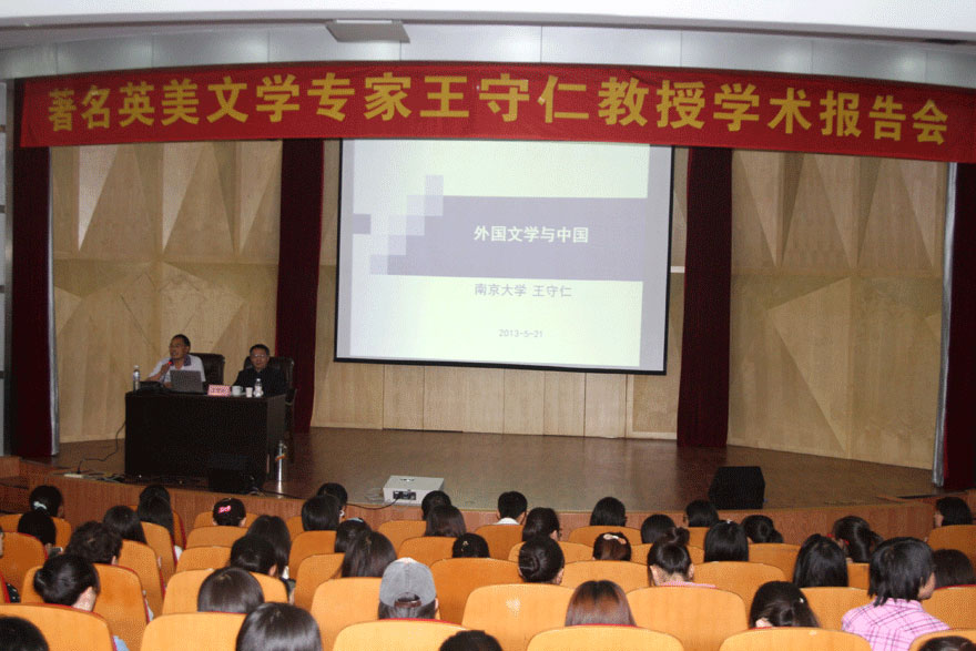 2013年5月21日上午,教育部高等学校大学外语教学指导委员会主任、全国英语文学研究会会长、中国外国文学学会副会长、中国英语教学研究会副会长、国家社科基金项目评委、鲁迅文学翻译奖评委、首批国家教学名师、南京大学外国语学院博士生导师王守仁教授应邀在吃瓜 学术报告厅做了题为“外国文学与中国”的学术报告。报告会由山东省外国文学学会副会长、师范学院英语系主任李汝成教授主持,来自吃瓜 师范学院、外语学院、文学院、中国海洋大学外国语学院的近400名师生聆听了报告。