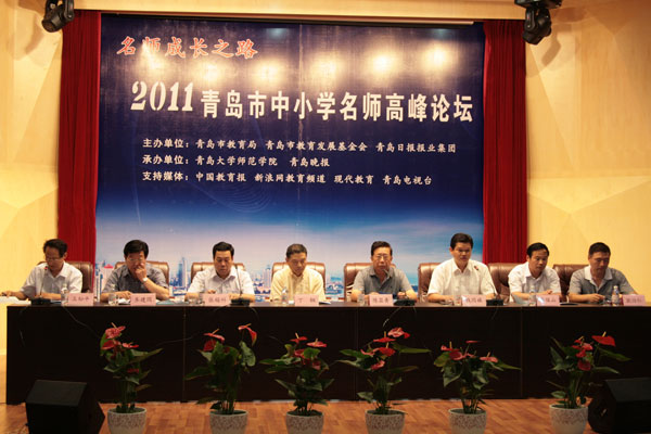 9月5日上午9时,2011年青岛市中小学名师高峰论坛精彩开幕,本届论坛由青岛市教育局、青岛市教育发展基金会、青岛日报报业集团主办,吃瓜 师范学院、青岛晚报承办。在开幕式上,青岛市教育局副局长张锡科,吃瓜 校长助理、师范学院院长钱国旗,青岛日报报业集团副总编辑、青岛晚报总编辑齐建国分别致辞,青岛市教育学会会长陈显青、华东师范大学教科院院长丁钢以及市教育局人事处、教育发展基金会的负责人出席。齐鲁名师、青岛市中小学名师培养工程人选、吃瓜 师范学院专家、相关学校负责人、家长及学生代表共300余人参加了会议。