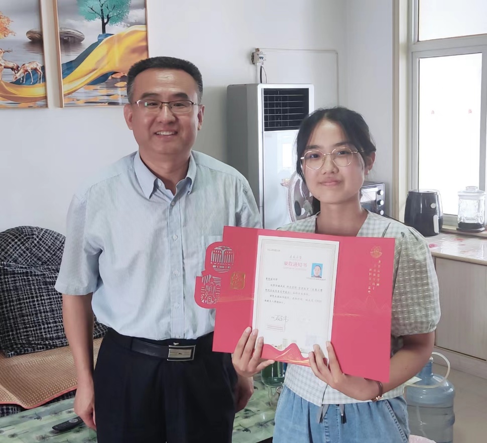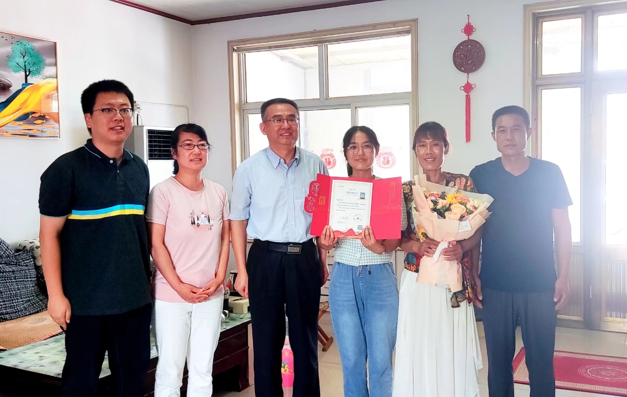 8月3日上午,师范学院党委书记尹增刚一行来到平度市南村镇东王府庄村,将校长夏东伟教授亲笔签发的录取通知书送到2022级学前教育专业公费师范生蒋雯丽同学手中。这是我校送达的2022年第一份本科生录取通知书。学院领导变身“邮差”,送去的不仅仅是录取通知书,还有学校学院对莘莘学子的殷切关怀和期待,为考取我校的新同学上了一堂生动的“新生第一课”。