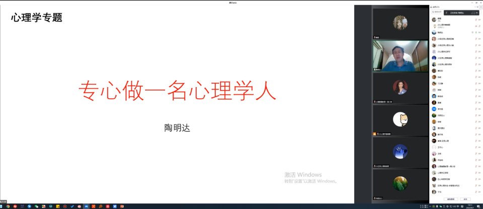 因疫情影响,本学期研究生新生入学报道推迟。为缓解研究生新生焦虑情绪,保证入学各项工作顺利开展,9月7日晚19点,心理学系举办研究生全体新生入学线上见面会,会议由党支部书记魏星主持。副院长陶明达教授介绍心理学系基本情况,并为同学们做《专心做一名心理学人》专题报告,结合心理学的学科属性以及学科特殊性,对如何过好研究生阶段的学习生活提出了宝贵建议。