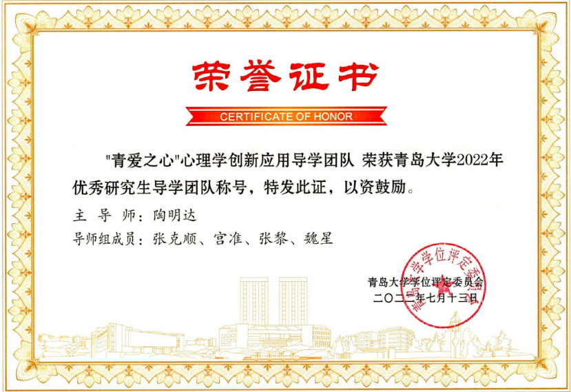 近年来,心理学系高度重视研究生培养质量,严把培养过程每一个环节。研究生在国家级竞赛、高水平文章发表、优秀毕业论文等方面均取得了优异成绩。今年7月,以陶明达教授为主导的“青爱之心”心理学创新应用导学团队,荣获吃瓜 优秀研究生导学团队称号。