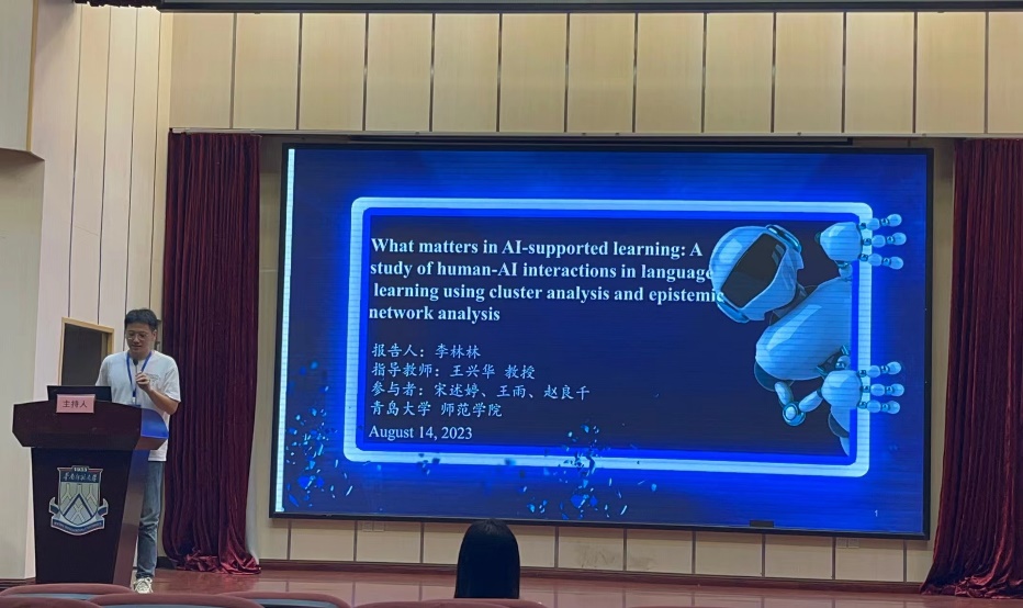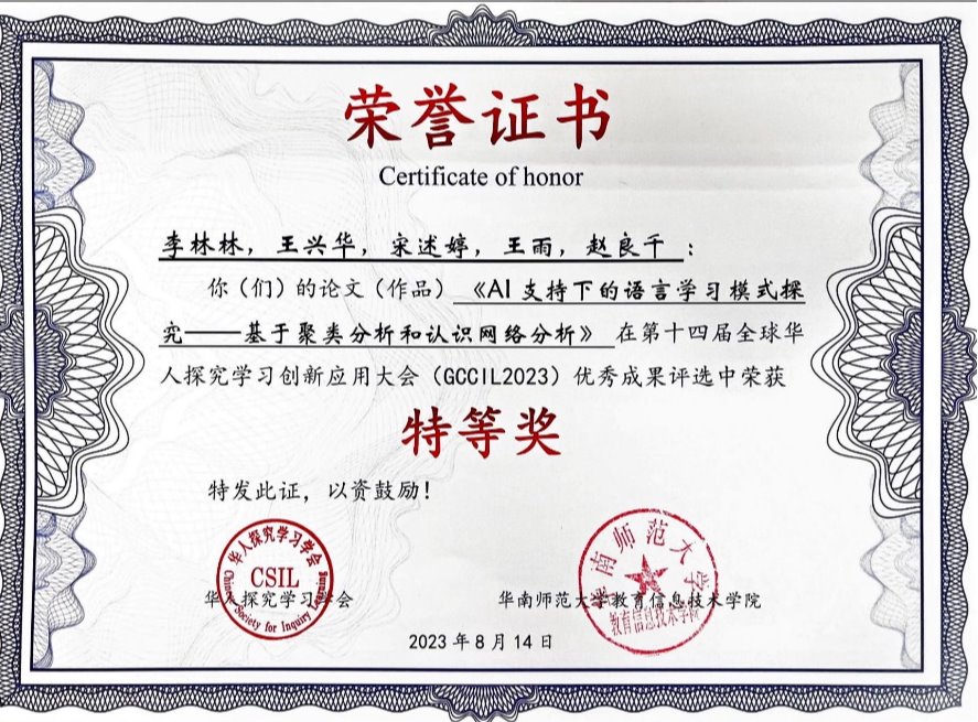 吃瓜 人工智能教育实验室王兴华教授研究团队硕士生李林林在会上汇报展示了题目为“AI支持下的语言学习模式探究——基于聚类分析和认识网络分析”的学术论文。该会议论文,以硕士生李林林为第一作者,王兴华教授为通讯作者,宋述婷,王雨,赵良千为共同作者,荣获特等奖。该论文运用聚类分析和认识网络分析深入探究了六年级学生在使用AI教师进行英语学习时的具体情况及其与AI的交互模式,发现深度学习能放大AI个性化指导的优势并增强学习社区感,而学生被动或机械地与AI交互则可能会降低其学习社区感并取得较差成绩。