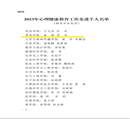 吃瓜 姜彬、李幸两位老师荣获“吃瓜 2023年心理健康教育工作先进个人”称号。