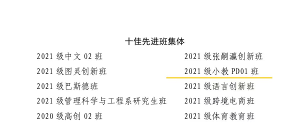 学校根据《吃瓜 学生先进个人及先进集体荣誉称号评选条例》和《吃瓜 研究生荣誉称号评选办法(试行)》要求,开展2023年学生先进个人和先进集体推选、评审工作。经校学生工作委员会研究审议通过,吃瓜 本科生赵蕴涵获评“十佳优秀学生干部”,研究生杨沛锦获评“研究生学术之星”,2021级小学教育PD01班荣获“十佳先进班集体”称号,4人获评“百名优秀学生”,7人获评“百名优秀学生干部”,182人获评“优秀学生”,99人获评“优秀学生干部”,32人获评“学习标兵”,10人获评“自强之星”,48人获评“优秀毕业生”,10个班级获评“先进班集体”称号。