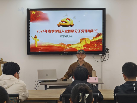 4月18日下午,师范学院党校于德润楼201会议室开展2024年春季学期入党积极分子党课培训班开班仪式。本次培训,学院特邀青岛市军休老年大学的军休干部卢勇老师为大家授课。师范学院本科生第一党支部书记张宁、研究生党支部书记潘婷与学院2024年春季学期全体入党积极分子参会。