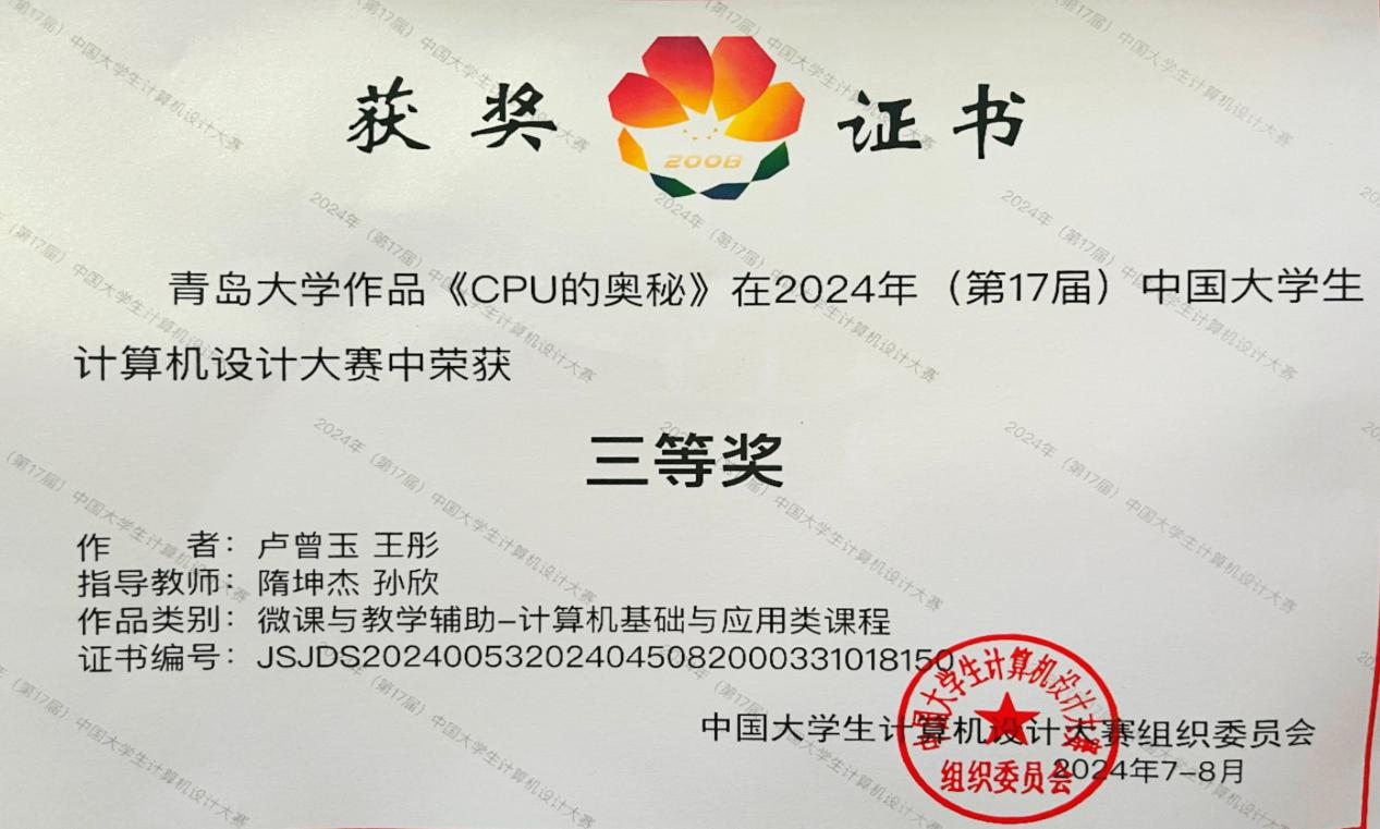 近日,第17届中国大学生计算机设计大赛在东北大学落下帷幕,吃瓜 隋坤杰、孙欣两位老师指导作品《CPU的奥秘》和姜彬老师指导作品《英雄梦•破阵情》两件作品在省赛中脱颖而出,荣获国家级赛三等奖。