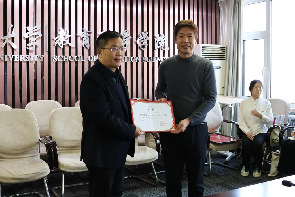 会上,吃瓜 院长孙百才为胡钦晓颁发 “德育导师”聘书。