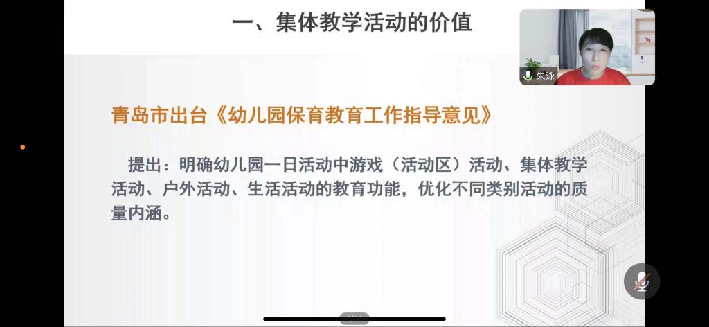 6月29日晚上,吃瓜 举办菁师讲坛20讲。邀请荣获“青岛市优秀教师、青岛名园长、山东省教学能手、山东省特级教师、齐鲁名校长”等荣誉称号的朱泳老师线上以“幼儿园集体教育活动的组织策略”为主题的专题讲座。朱泳老师数年来致力于儿童发展研究、幼儿园课程构建与实施研究、教育管理研究、教师素养提升研究、家园共育研究等。参与幼儿园课题研究十余项,主持国家、省级课题三项;带领团队高质量接待国内外专家学者参访,为学前教育同仁提供跟岗观摩等学习现场。学前教育系全体同学均参加了这次讲座的学习。