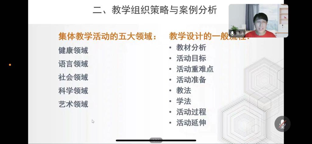 朱泳首先从幼儿园集体活动的价值开始,告诉了同学们幼儿园集体活动的重要性,集体活动是幼儿园教学中必不可少的。她倡导大家要在设计集体活动时,遵从《3-6岁幼儿学习与发展指南》,利用正确的理论去引导实践。