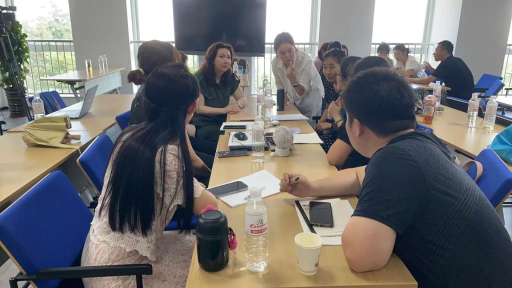 名师学员们还以分组合作形式围绕 “启发式任务设计”进行了方案设计、课程设计等活动。白俄罗斯国立大学英语系主任奥尔加教授团队则对实践作业进行了针对性指导和点评。她解析了教学任务设计的核心维度,包括课程分析框架、问题设计原则、课堂分类逻辑及评价标准,为教学实践提供了可操作的方法。