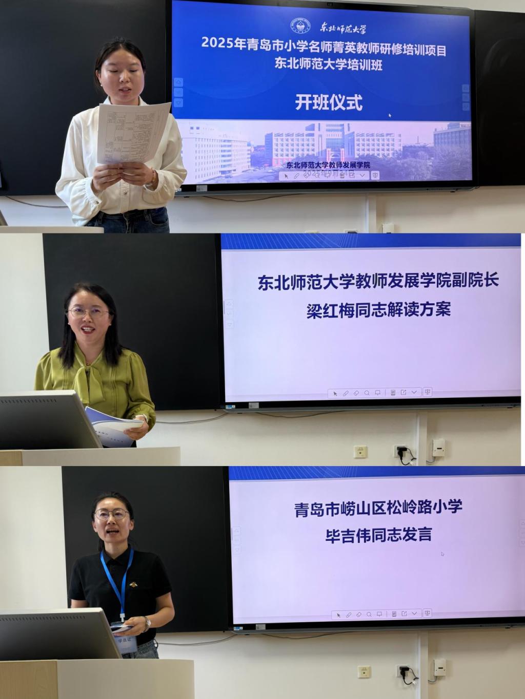 开班仪式由东北师范大学教师发展学院刘媛媛老师主持。仪式伊始,东北师范大学教师发展学院院长陈欣、吃瓜 党委书记刘清亮分别致辞,希望参训教师立足“育人初心”与“专业成长”双重视角,努力成为观念新、懂教育、会教学、擅科研的名师。随后,东北师范大学教师发展学院副院长梁红梅解读此次研修活动方案,青岛市崂山区松岭路小学毕吉伟老师作为学员代表进行发言,她结合基层教学实践需求表达对此次研修活动的热切期待。